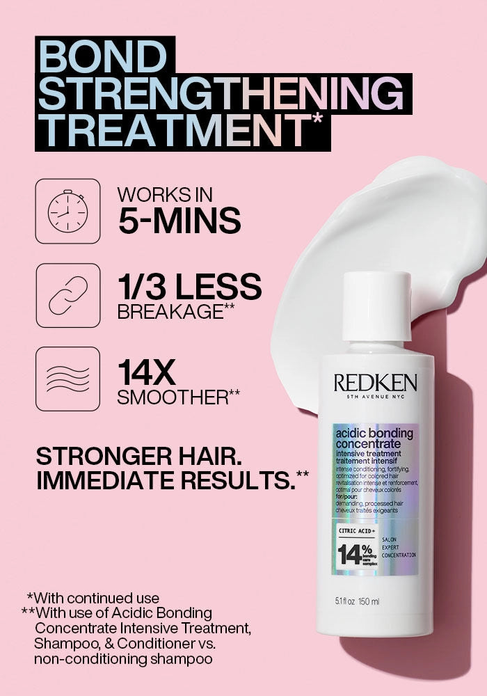 Acidic Bonding Concentrate Intensive Treatment is Step #1 (pre-shampoo) of Redken's most concentrated system ever with citric acid. Redken's Bonding Care Complex provides ultimate strength repair, intense conditioning, and color fade protection in all types of highly damaged or processed hair.