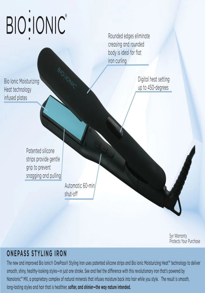 The new and improved Bio Ionic® OnePass® Styling Iron uses patented silicone strips and Bio Ionic Moisturizing Heat™ to deliver smooth, shiny, healthy-looking styles—in just one stroke.