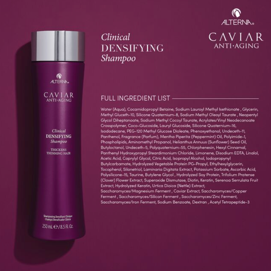 Alterna Caviar Anti-Aging Clinical Densifying Shampoo is a gentle cleansing treatment formulated with a soothing texture to cleanse the scalp, eliminate impurities and build-up, and give the appearance of fuller, thicker hair.