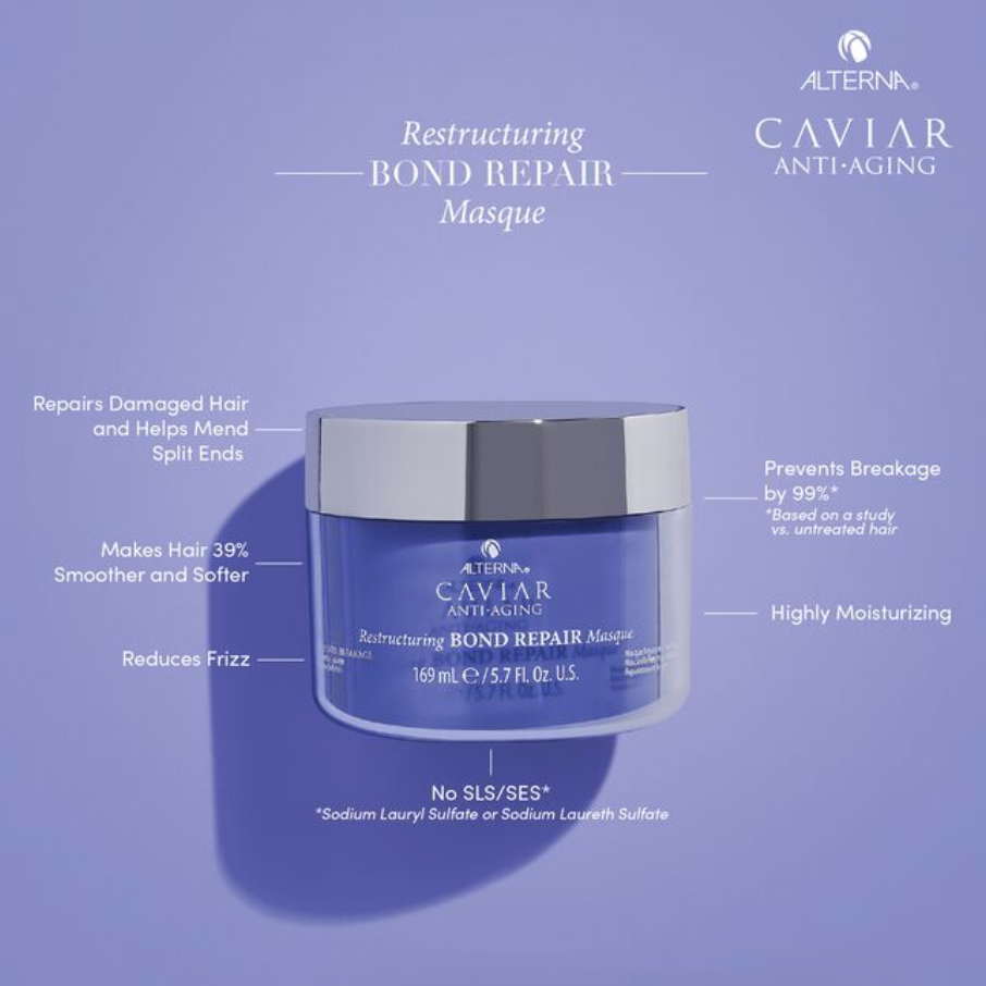 Alterna Caviar Anti-Aging Bond Repair Masque is a deeply moisturizing reparative treatment masque that repairs damaged hair, mends split ends, prevents breakage, and leaves hair healthier, shinier, softer, and less frizzy.
