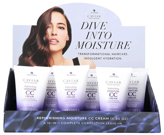 Dive into Alterna's Transformational Moisture. This retail display features 12 mini Replenishing Moisture CC Creams (0.85 oz). The Replenishing Moisture CC Cream is a perfecting leave-in products that delivers 10 benefits in one easy step.