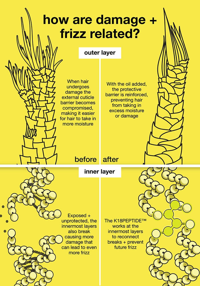 - Strengthening, smoothing hair oil works on two levels of the hair fiber to fight frizz. The K18PEPTIDE™ works to address deeper-level damage that causes frizz - repairing and strengthening damage at the innermost layer of hair to reverse damage that leads to frizz. On the surface of hair, natural oils like avocado and sunflower oil, and hemisqualane and squalane nourish while smoothing frizz + flyaways to improve color vibrancy, enhance shine, and provide 450°F (232°C) heat protection.