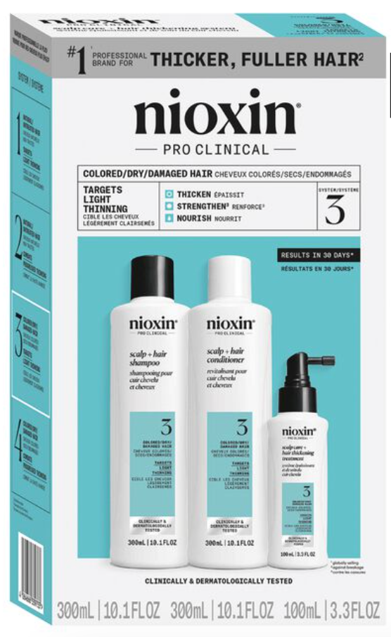 Nioxin's System 3 Kit Includes: Scalp + Hair Shampoo 10.1 oz, Scalp + Hair Conditioner 10.1 oz and Scalp Care + Hair Thickening Treatment 3.3 oz.