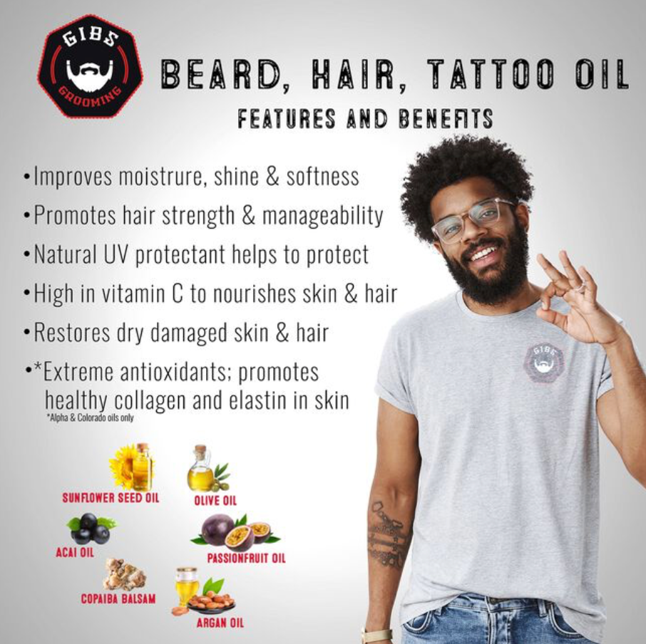 The amazing Voodoo oil has a spell binding fragrance with hints of bergamot, sage, and sandalwood. Olive and Argan oils soften while Sunflower oil strengthens and protects. Passion Fruit and Copaiba Balsam oils are used to help moisturize the skin and hair. Apply on your beard, hair and skin as part of your daily Gibs Grooming routine!