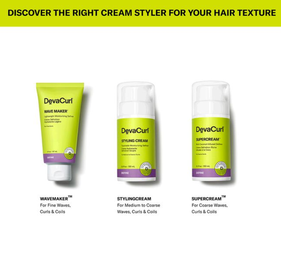 If you have dry, medium to coarse curls, Styling Cream, a rich cream with a hydra-definition blend is recommended. If you have dry, coarse curls, DevaCurl® recommends SuperCream, a multi-tasking ultra-rich cream with a hydra-definition blend.